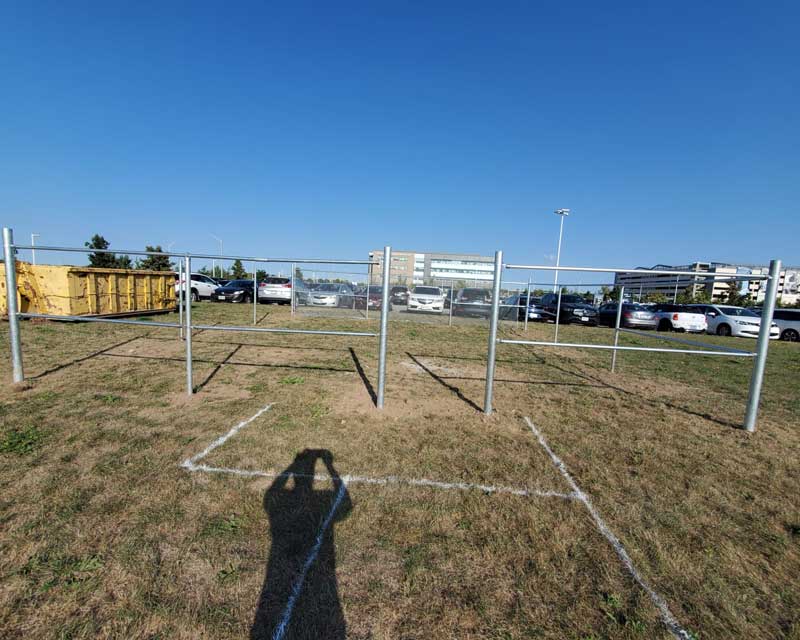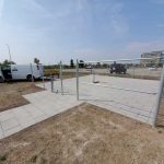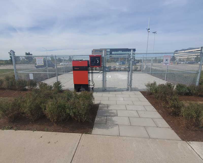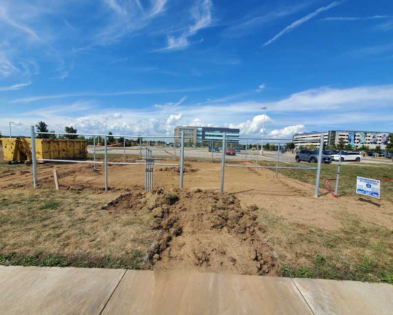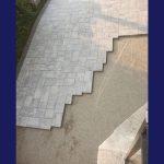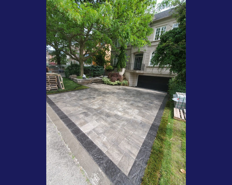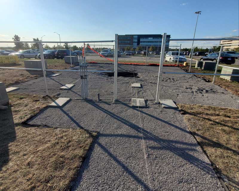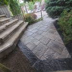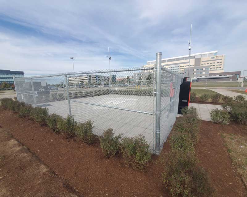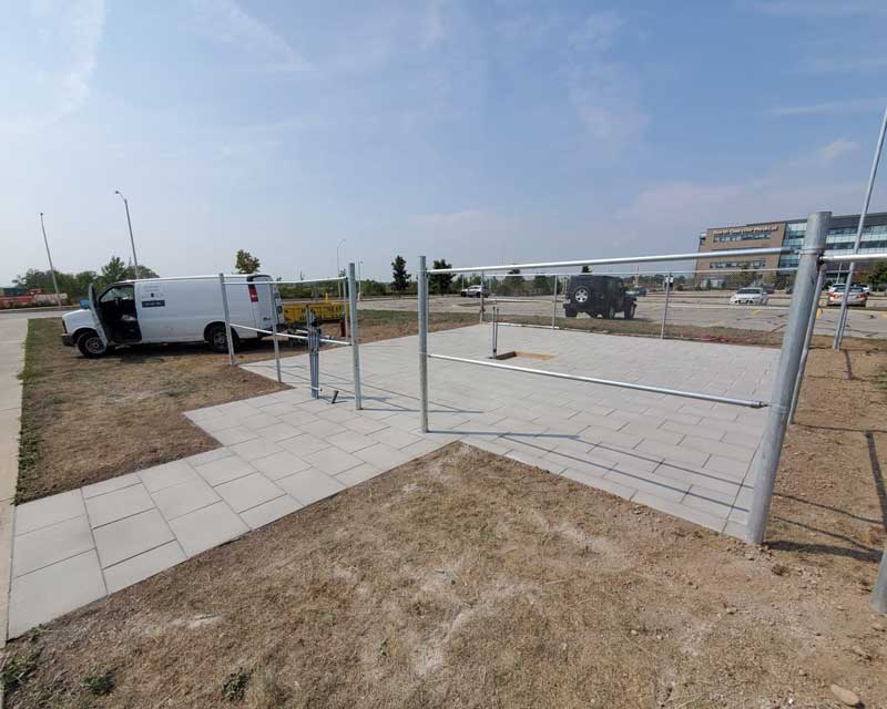 At Oakville Trafalgar Memorial Hospital, we excavated a large area, leveled it, installed HPB, added landscape fabric, and laid large 24 x 30 patio stones. This area is fenced off and private. It was built to be used as a drone landing pad and was one of the first test sites for a medical drone landing area.