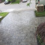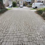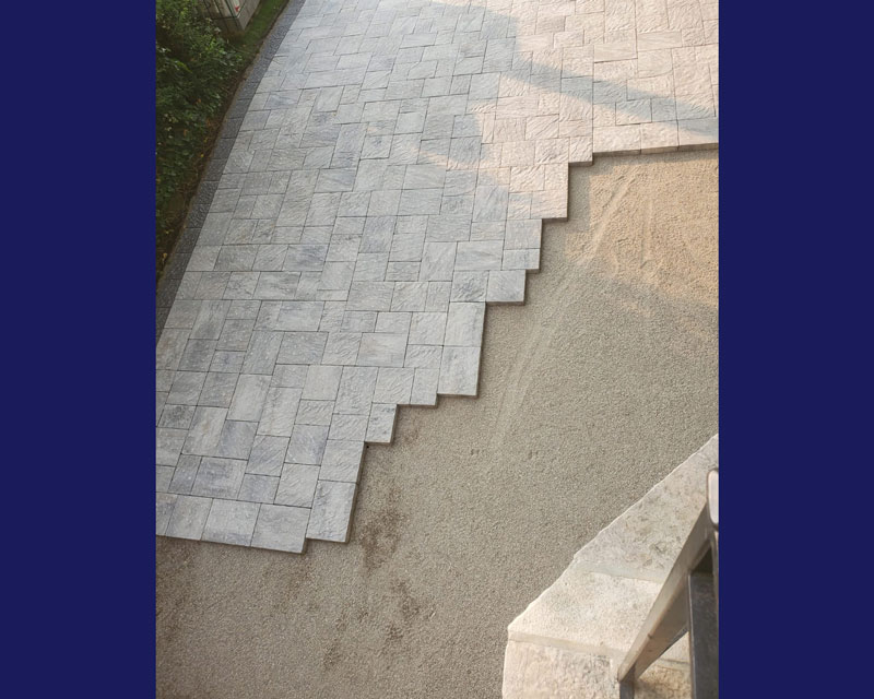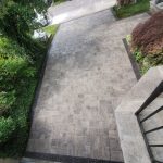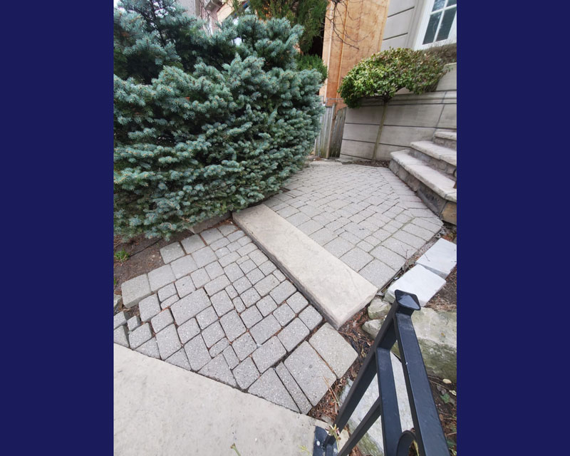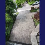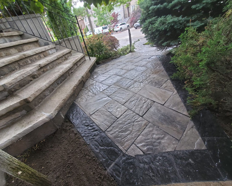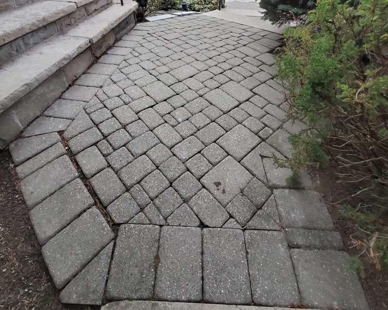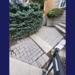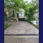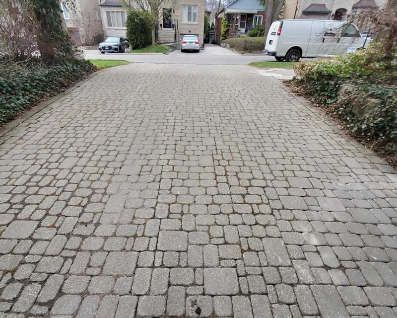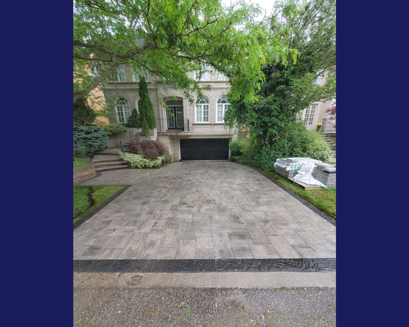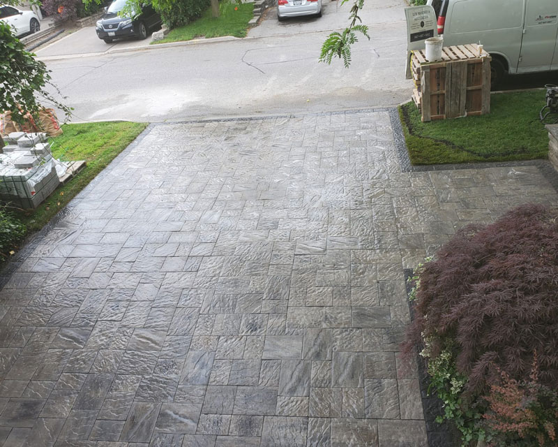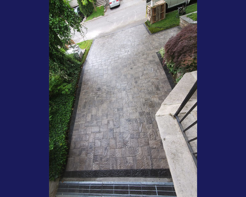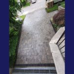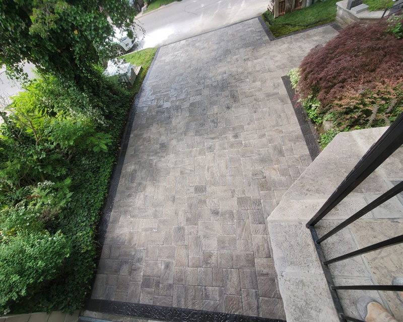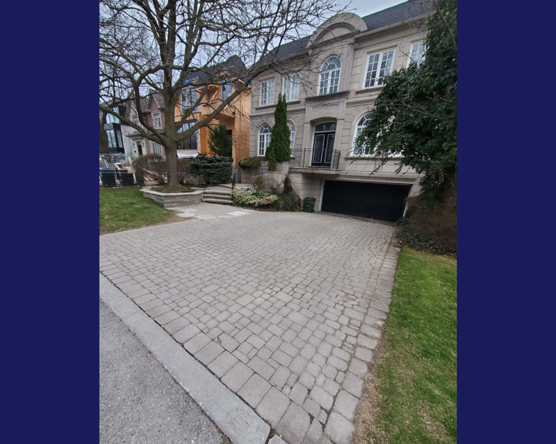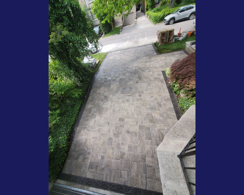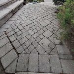 This driveway was built with older stones at the entrance to an underground parking area. Constant vehicle traffic caused the stones to sink. The concrete base broke, and the metal rail above the drain rusted and collapsed. We removed all of the stones, regraded the ground, rebuilt the wall, fabricated a new metal cover for the drain, and replaced the entire driveway with new stones. The water now drains properly into the drain, the wall is solid, and the new metal cover should last longer.