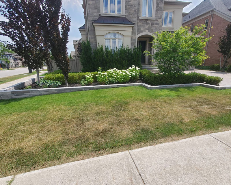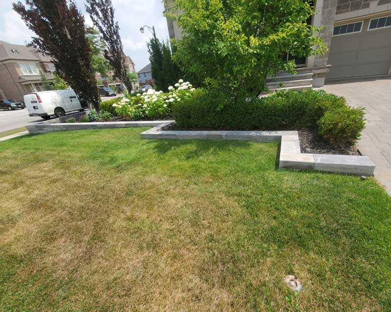 This wall was built to improve curb appeal. The garden was plain, and the client wanted a small wall that would improve the overall look without taking attention away from the plants. We decided on a wall lining the garden, using stones that matched the front exterior and driveway. The wall was built three courses above ground, which was just enough to create a balanced look between the wall and the smaller plants within the garden.