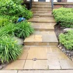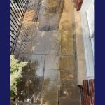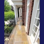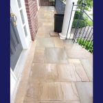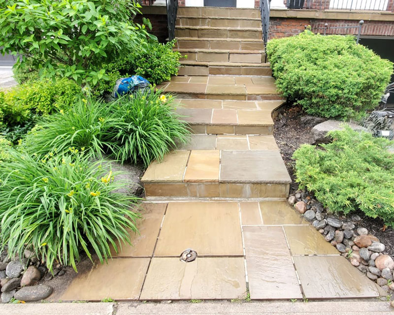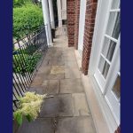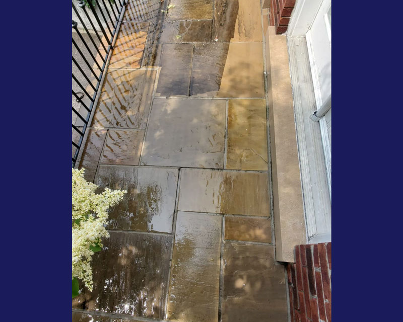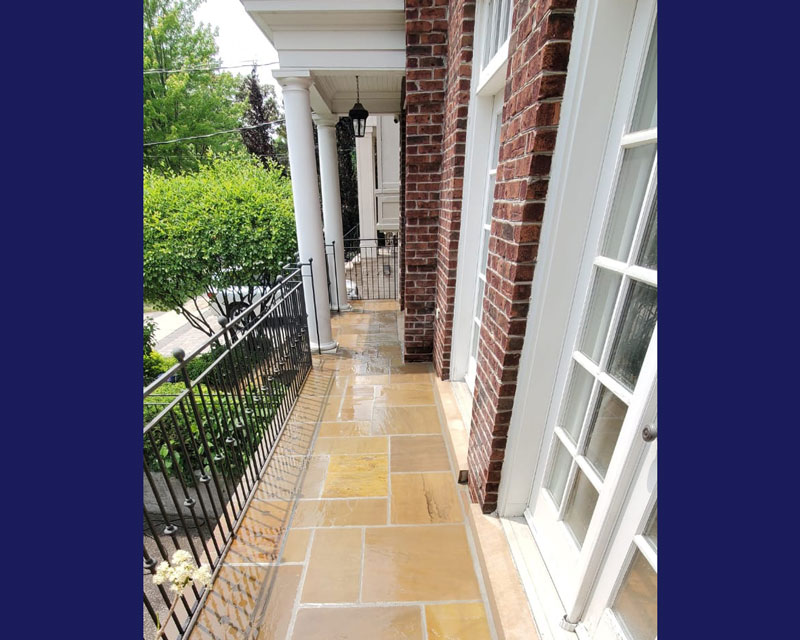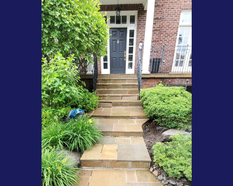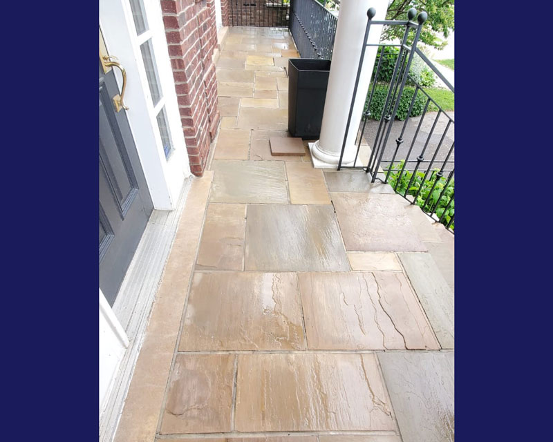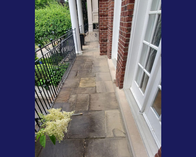This was a flagstone porch and landing surrounded by a large number of trees, and the stones were in very poor condition. We power-washed the surface, removed all of the joints, reset some of the stones on the walkway and steps, replaced all of the joints, and then sealed everything with a gloss-finish colour enhancer. This brings out the original colours in the stone while also protecting both the stones and the freshly pointed joints. It should last a long time, provided it is washed and resealed every few years to extend the life of the stone and joints.